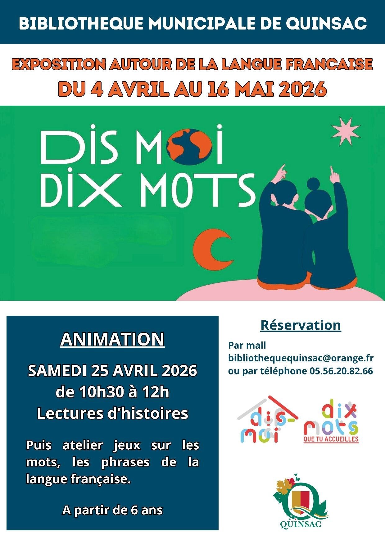 Information et réservation par téléphone au 05.56.20.82.66 ou par mail bibliothequequinsac@orange.fr